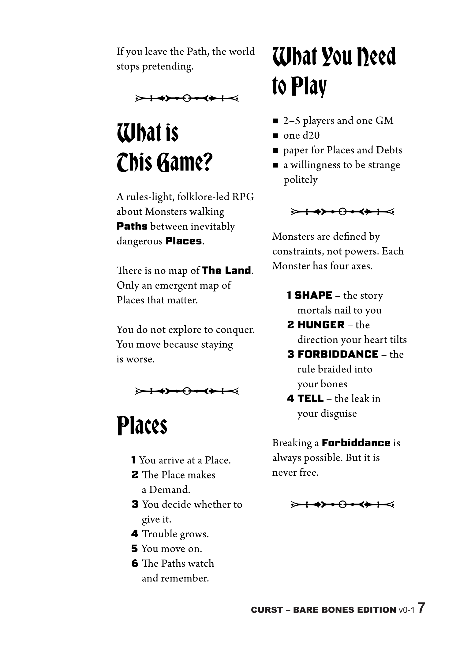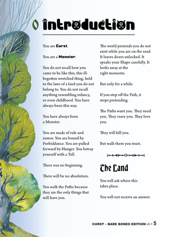 CURST is a rules-light folklore RPG about playing Monsters bound by Forbiddance and the relentless pull of the Paths. You walk between dangerous Places in an unforgiving Land that does not explain itself.