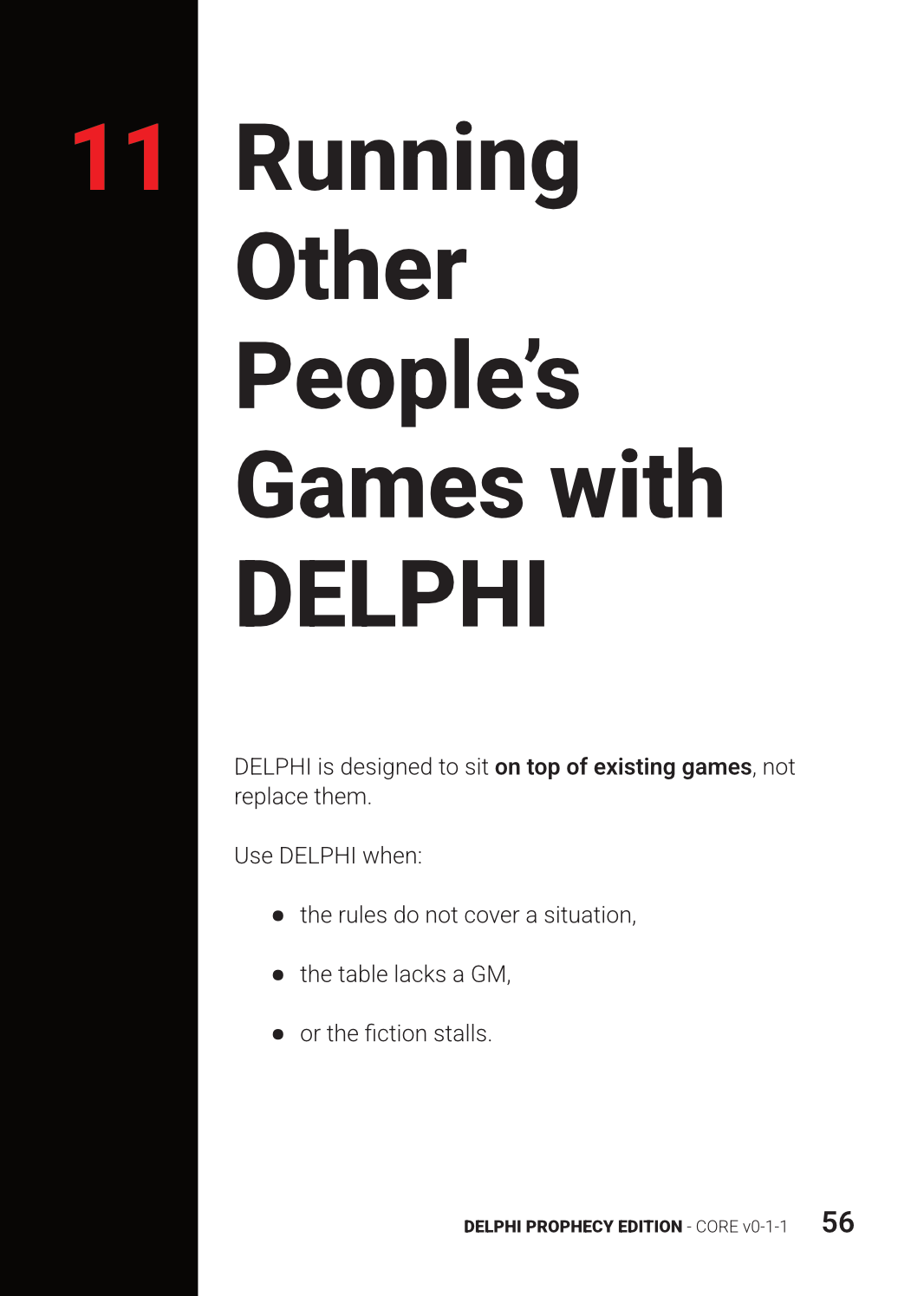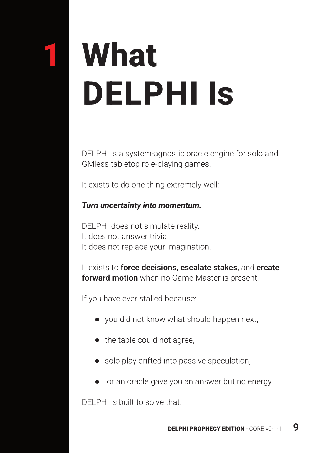 DELPHI focuses on intent, stakes, escalation, and consequence, using a compact set of interlocking oracles to generate momentum, tension, and surprise across any genre.