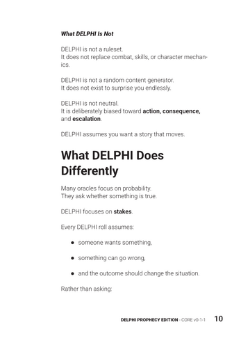 DELPHI: Prophecy Edition is a system-agnostic oracle engine for solo and GM-less roleplaying.